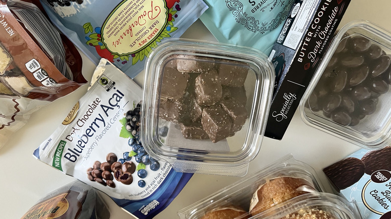 To pick comparable products, I scoured Trader Joe's and Aldi's websites to find the most similar items. For example, TJ's carries a range of gummies and cookies, but Aldi didn't have anything similar from its own brand(s) – it only carried Haribo gummies. Therefore, a lot of these products are chocolate-covered in some way — which I'm not mad about, but I would've enjoyed more range.