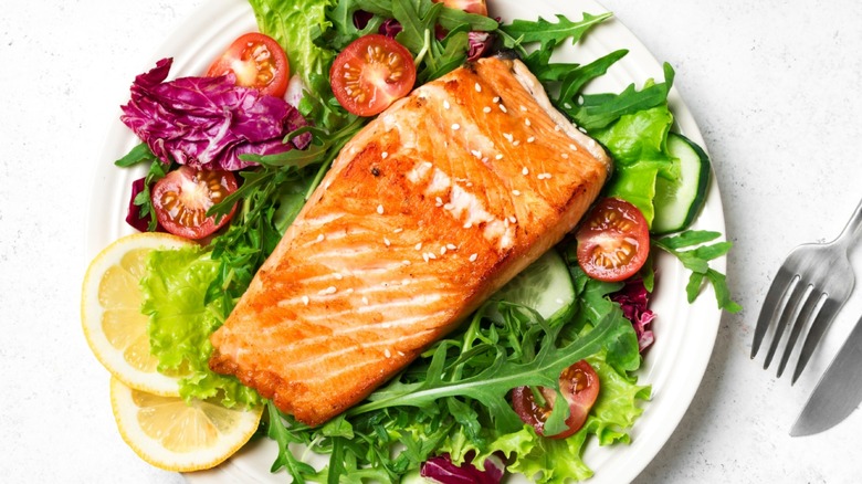 The fatty fish has a luscious mouthfeel that elevates the lettuce and celery, as well as a mild sweetness that both tempers the bitter radicchio and mellows out the dried tomatoes. To maintain the fresh flair of the salad, focus on salmon's natural flavors. Poaching the salmon filets in olive oil enhances the Mediterranean-inspired salad by imbuing the salmon with grassy notes, while also keeping the flesh extremely tender. When poaching the fish, add in some garlic cloves and slices of lemon to balance out the oil's peppery notes.
