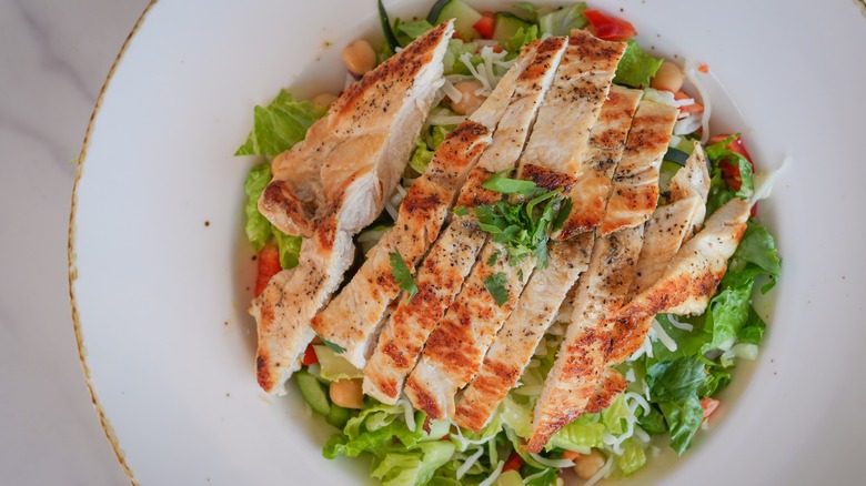 Wet brine the meat for a juicier finish, and add a sprinkle of lemon zest for a zingy taste. If you don't have access to a grill, searing the chicken breast still brings a rich flavor to the salad. To play up the flavors of the dressing, season the breast with Dijon mustard, smoked paprika, onion and garlic powder, and a dash of brown sugar.