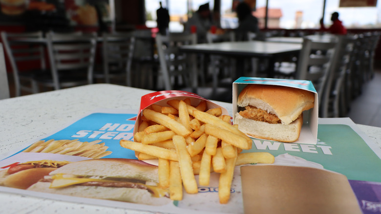 What really stands out at Krystal is the sheer number of combos and specials. Take the Pick 5 deal, for instance. It lets you pick five items from a handful of its classic items for around $6, though the price can fluctuate depending on location. Likewise, its "Sackful" deals allow you to buy one or two dozen sliders at a time. And who could forget the beloved Hangover Krystal, fittingly introduced on January 1st, a.k.a. National Hangover Day? This limited-time offer featured an original slider piled with cheese, bacon, and a fried egg on top. Krystal clearly has you covered with late-night and rough-morning food options.