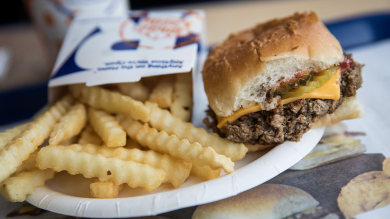 Although Americans are known for their big personalities and even bigger appetites, one of the country's most iconic food inventions is surprisingly small: the slider, though often used to feed a crowd. As a miniature version of the hamburger, sliders can usually be eaten in about two bites, making them ideal for a quick snack or a full-blown feast, depending on how many you order. Thanks to its petite size, the slider's bun-to-patty-to-toppings ratio is slightly different than a full-sized burger, giving each bite a powerful pop of flavor. While hamburgers are a well-known staple of American cuisine, the slider has carved out its own unique place in American food history. And when it comes to fast-food sliders, there are two clear contenders for the best in the game: White Castle and Krystal.