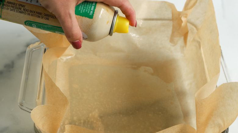- Place a piece of parchment paper in an 8x8-inch or 9x9-inch square pan, then lightly grease the parchment paper. Set aside.