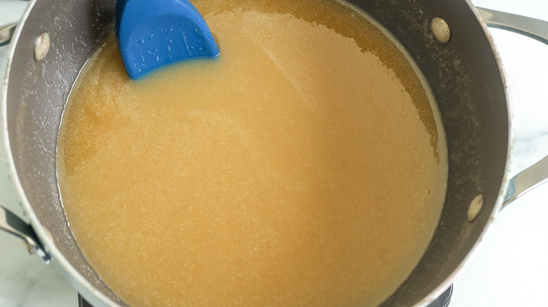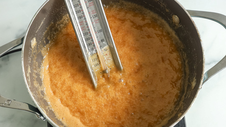 - Bring the mixture to a boil, then reduce the heat to medium-low and add a candy thermometer to the pot.