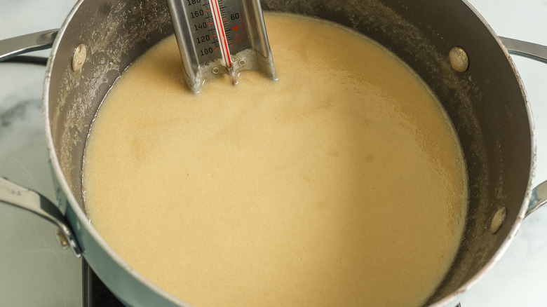 Bring the mixture to a boil, then reduce the heat to medium-low and add a candy thermometer to the pot.