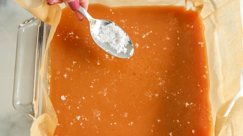 - Allow the caramel to cool for about 20 minutes, then sprinkle half of the flaked salt over the caramel.