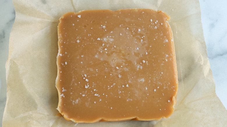 Let the caramel set at room temperature for at least 2 hours, then sprinkle the remaining salt over the caramel and carefully peel back the parchment paper on the sides of the caramel block.