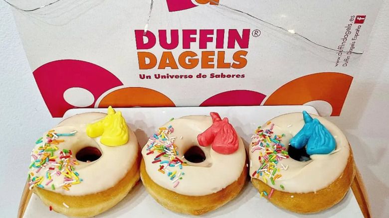 Walk the streets of Madrid and you might spot the pink-and-orange glow of a cafe, assuming it's Dunkin', but when you gaze up, you'll notice the name on the building proudly says "Duffin Dagels." No, it's not a joke or a typo, Duffin Dagels is a real brand that operates solely in Spain and has 10s of locations across the country. It's a big local contender with Dunkin's actual Spanish version of the chain named "Dunkin' Coffee," which has no association with the knockoff stores. There are some pretty striking similarities between the two that leave customers wondering how Duffin Dagels is even in operation.