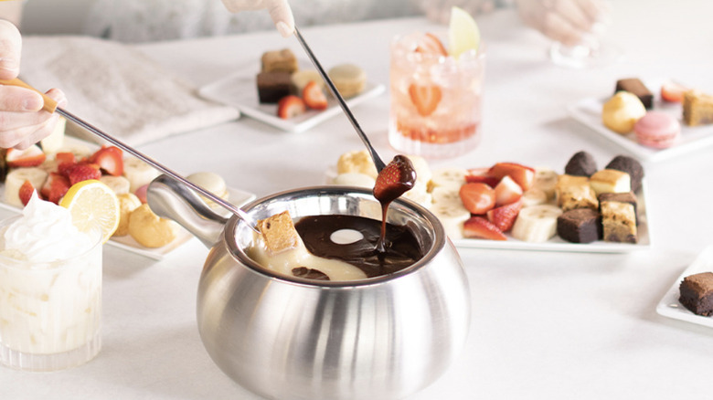Melting Pot inches onto the three-course meal scene, but at present, the action takes place only one night per week. The Melting Pot website bills it as the BFFF 3-Course meal, with "shareable sips and delicious dips." The extra F in the "best friends forever" moniker is a Melting Pot adaptation that reads "Best Fondue Friends Forever." As with any dining experience at Melting Pot, known as one of America's top cheese-themed restaurants, fondue steals the show with steamy, creamy pots of cheesy and chocolatey goodness. Between the first-course cheese fondue and the third-course chocolate one, there's a fresh salad to crunch things up a bit.