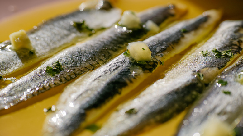 Easy to make, tasty, and works in everything from a rye sandwich's filling to a meal all in itself ... that's a creamy egg salad. All you need is some hard-boiled eggs and some mayo, and that's everything you need to whip up your own version. Suppose you've been feeling a bit tired of the incredibly rich and creamy flavor of the classic recipe. Well, in that case, we've got one pretty divisive ingredient that we guarantee will freshen up your salad with a powerful umami boost. It's the mother of all umami-rich foods — anchovies.