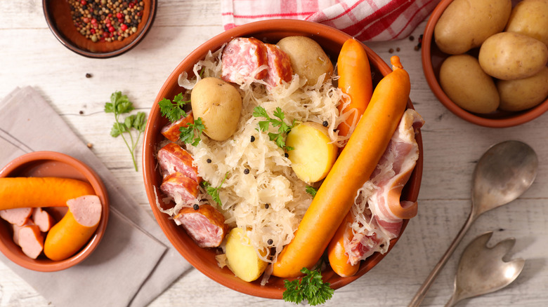 There are also many other amazing ways to use canned vienna sausage, and sauerkraut fits right into most of them. Send them straight into a pan of fried rice or stir-fried noodles should the meal call for something filling and easy. Need a quick, breezy game day treat? Grab a few hot dog buns and use the sauerkraut as a topping, possibly alongside pickles and mustard. Slightly more off-kilter is Vienna sausage sauerkraut tacos or burritos — a peculiar fusion that you can jazz up with Mexican chorizo, fresh avocado, and a salsa on the side. You can also take your appetizer game up a notch by wrapping the sausages in bacon before serving it over a bed of potatoes and sauerkraut.