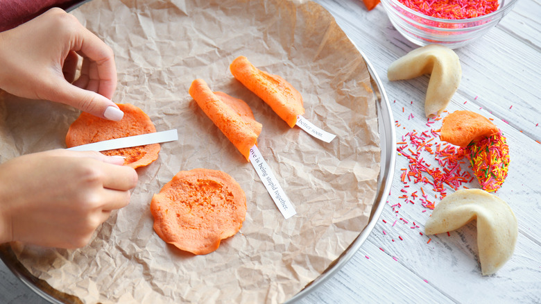 Snapping a fortune cookie in half to reveal the paper message inside is a delightful way to finish off a meal. Plus, the crunchy cookie itself is just sweet enough to provide the perfect balanced bookend to a savory dinner without the need for a rich dessert. But if you're gluten-free, do you have to miss out on all the fun of enjoying the crisp texture and reading your fortune aloud to the table? Unfortunately, in most cases, fortune cookies contain gluten unless you search for specific brands that use gluten-free ingredients.