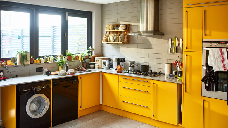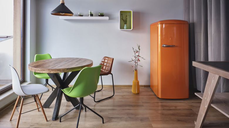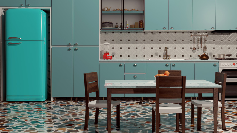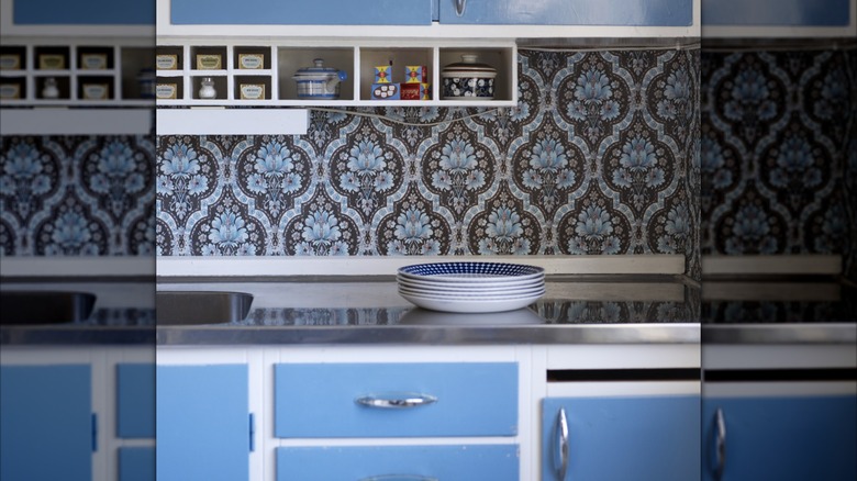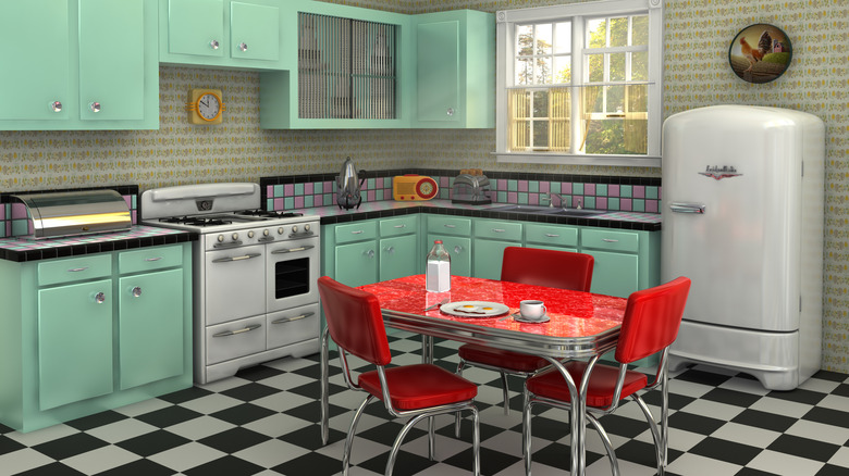 Thinking about wallpapering the walls in your kitchen may feel a bit daunting, but with the right tools, the process should go more quickly than you're likely anticipating. Wallpaper can also be more affordable than you might think. According to Niemela, "You can get decent rolls for $80 to $120 and cover a feature wall for under $400 total." However, wallpaper isn't the only option for a retro kitchen. If you're going to go the paint route, Noz Nozawa recommends picking a pastel color. Some options to consider include sea foam green, peach, lemon, and pink.