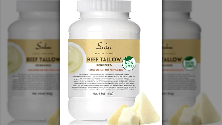 Sulu Organics sources its tallow from pasture-raised U.S. cows. The tallow is a premium, grass-fed product free from hormones, vaccines, antibiotics, and GMOs. Sulu renders its tallow from suet — as mentioned previously, the fat that surrounds the kidneys. Suet, which shouldn't be confused with lard (pork fat), is melted down to a liquid over low heat. The liquid tallow is then filtered and purified without preservatives, which results in a clean, nutrient-rich tallow. Sulu offers its beef tallow in 4- and 7-pound plastic tubs.