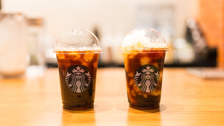 Customers who visit both coffee brands will immediately notice that each names its drink sizes differently. Starbucks uses its own naming system for its hot coffee — short (8-ounce), tall (12-ounce), grande (16-ounce), and venti (20-ounce). The chain's cold drinks start at tall and go as large as trenta, which is 30-ounce. If you're looking for a Frappuccino, you'll only have the option of tall, grande, or venti. The brand's refreshers, which include lemonade, coconut, dragonfruit, and other options, range from tall to trenta.