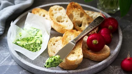 The simplest way to have the first taste of your homemade spring veggie compound butter is by spreading some of it on top of a slice of sourdough or baguette. Between the bread (better if toasted!) and the cool, herb-flecked butter, you'll have one heck of an appetizer. It's also an amazing treat for guests that takes no more than five minutes to prep.