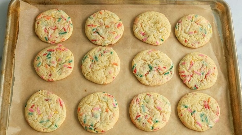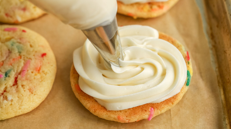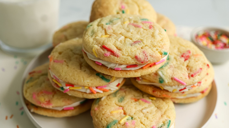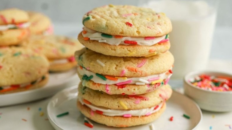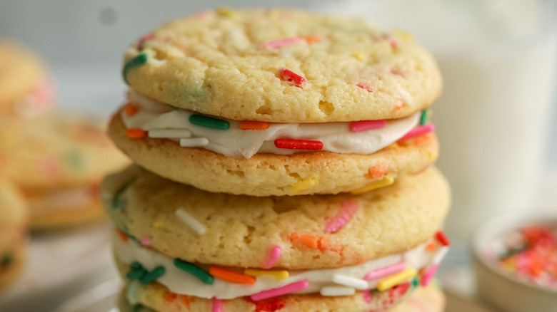 This cookie sandwich recipe is incredibly customizable, both in terms of the cookies and the frosting filling. For starters, since the cookies are made from boxed cake mix, you can essentially use any flavor or type of boxed mix that your heart desires. "Lemon, strawberry, or red velvet cake mix would all go really well with the cream cheese frosting," Morone suggests. Also, if you aren't a fan of the birthday cake theme, you can still follow this recipe exactly as written, using vanilla cake mix as the base and simply omitting the sprinkles. Or, opt for a different kind of sprinkles — chocolate sprinkles would work great here and add a different flavor, though you can get creative with the sprinkle colors to fit whatever theme you're going for.