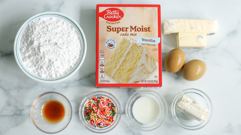 For the sandwich cookie portion of this recipe, the bulk of what you need comes in a standard box of vanilla cake mix. You'll also need melted and cooled butter, a couple of eggs, vanilla extract, and colorful sprinkles, since the theme is birthday cake after all.