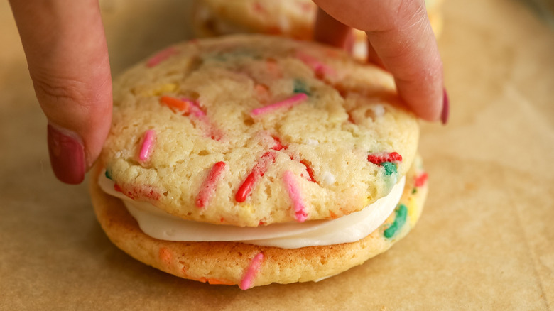 There's another added perk to using boxed cake mix in this recipe, of course, which is that these sandwich cookies are incredibly simple to whip up. As Morone says, "I love these because they are really fun looking, taste just like birthday cake, and are really easy to make." Despite boxed cake mix making up the cookie sandwich portion of the treat, there's still a nice homemade feel from the cream cheese frosting in the middle, a richly sweet and subtly tangy frosting that would work equally as well with a plethora of other cake flavors.