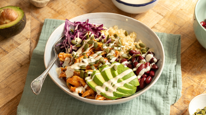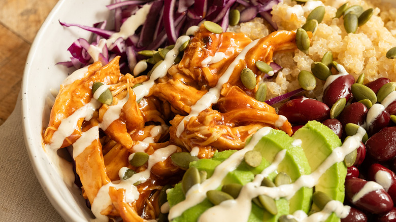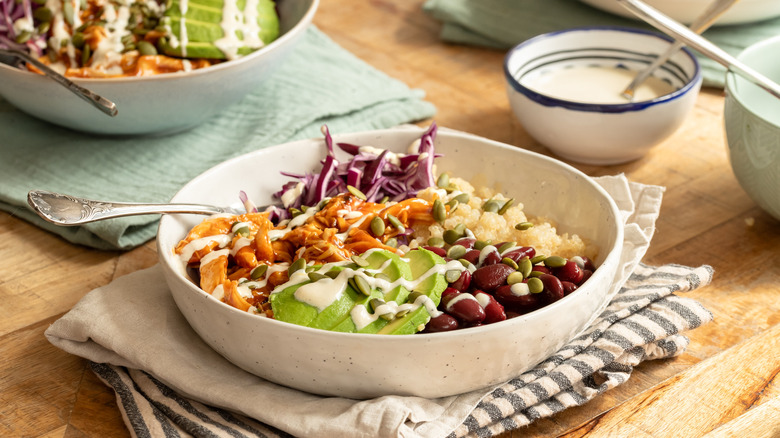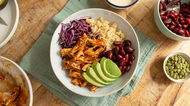 - To assemble the protein bowls, divide the quinoa, kidney beans, avocado, red cabbage, and shredded barbecue chicken between two bowls.