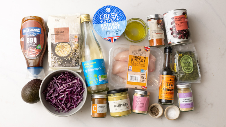 For the protein bowl itself, you will want chicken breasts, olive oil, barbecue seasoning, quinoa, barbecue sauce, kidney beans, avocado, red cabbage, and pumpkin seeds. For the Alabama white sauce, you will need Greek yogurt, white wine vinegar, Dijon mustard, Worcestershire sauce, garlic powder, onion powder, black pepper, sea salt, and a pinch of cayenne pepper.