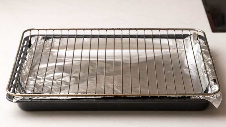 - Line a baking sheet with aluminum foil and top it with a grill tray.