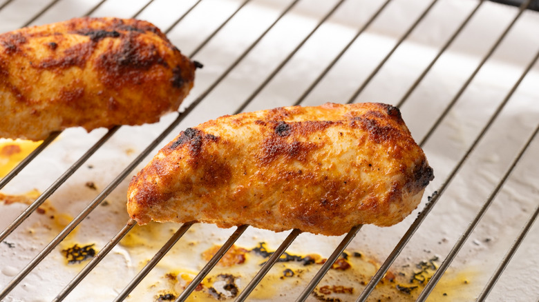 - Place chicken breasts onto grill tray and then transfer to the oven. Broil for 7 to 8 minutes.