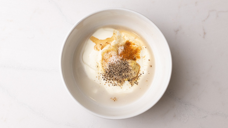- Make the Alabama white sauce: To a bowl, add the Greek yogurt, white wine vinegar, Dijon mustard, Worcestershire sauce, garlic powder, onion powder, black pepper, salt, and cayenne pepper.
