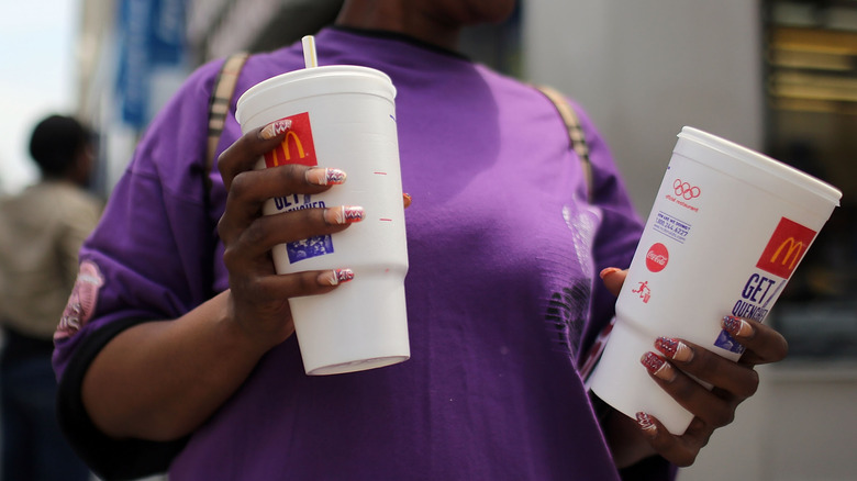 Back in 1955, when McDonald's first partnered with Coca-Cola, drinks only came in a 7-ounce size. But today, in America, you can walk out with almost an entire liter. Although we can all agree that McDonald's Sprite and Coke taste better than they do at other fast food restaurants, why the huge discrepancy between sizes? It boils down to a few things, including an American societal viewpoint that "bigger is better." The trending phenomenon of upgrading sizes for a small increase in price has led to a generalized growth in American portion sizes. If you're visiting America for the first time, don't be surprised if you see someone walk out of a 7-Eleven gas station with a gallon-sized cup of Dr. Pepper — it's pretty normal around here.