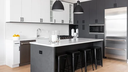 The first thing you can add are simple shelves and cabinets. Use them to store pots and pans, large baking sheets, appliances that are cluttering your countertops, and heavier items (Dutch ovens, instant pots, etc.) that are hard to move up and down from high shelves above the counter. The kitchen island can also be a convenient place for certain electric appliances, especially when there's a lack of space elsewhere. Installing a microwave, a dishwasher, or even a cooktop is a great space-maximizing solution.