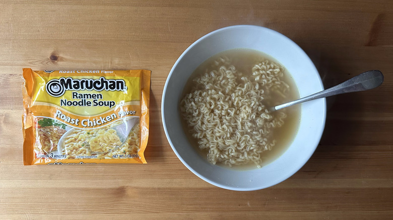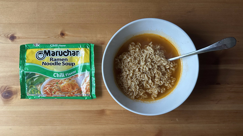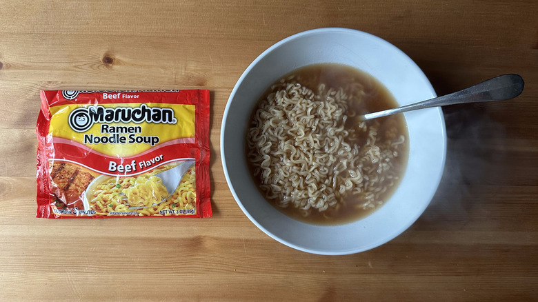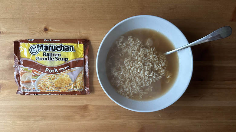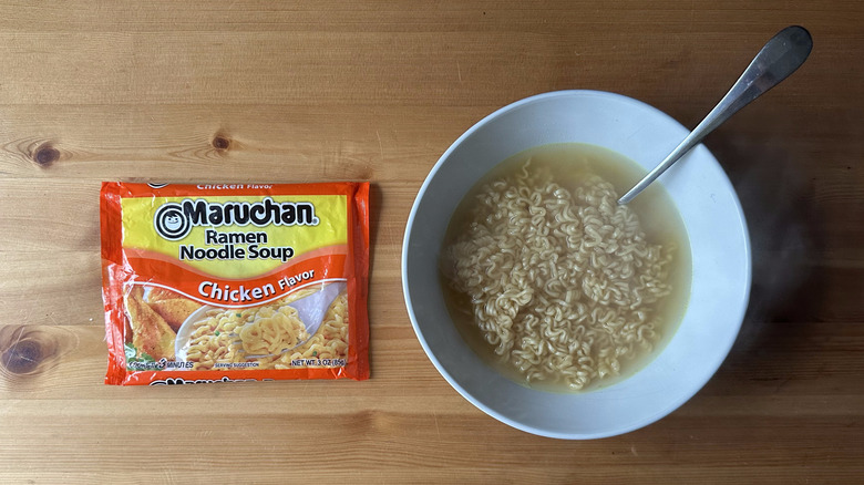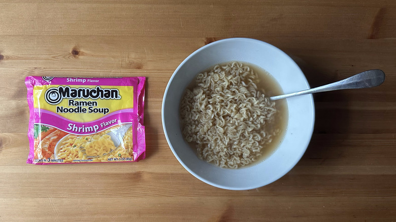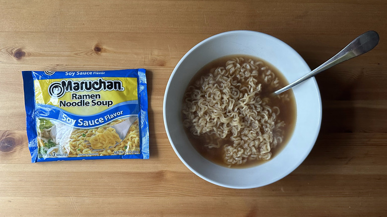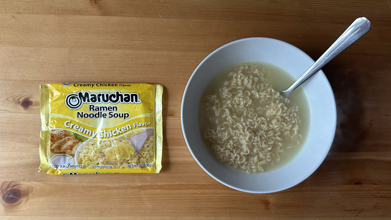 Luckily, there are ways to remedy this overly salty flavor profile. You can either choose to use a smaller portion of the flavor packet or simply add more water to the mix. Either way, you'll be left with a milder broth that you can then add other ingredients to if you want to enhance the flavor further. However, if you prepare this stuff as intended, you're going to end up with an over-salted bowl of soup that doesn't taste great.
