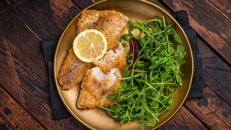 Pollock is another white fish that's commonly compared to cod, and similarly found in both the Atlantic and Pacific Oceans. When choosing pollock for dinner, there are two varieties to consider: Alaska pollock and Atlantic pollock. Regardless of the origin, it's a surprisingly dense fish with a mild, adaptable flavor. In fact, that California roll you ordered might actually be made of pollock. After all, it's typically the main ingredient in the fish paste used to make imitation crab meat (or surimi).