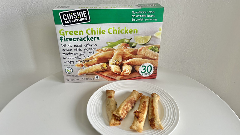Compared to the taquitos, the Cuisine Adventures green chile chicken firecrackers are slightly crunchy, slightly delicate because they're in a crisp wrapper rather than a tortilla. They have white meat chicken, green chilies, and Monterey Jack and mozzarella cheeses. You'll get 30 log-shaped delights that are flavorful in an approachable way, making them perfect to put out for a sports party or an afternoon get-together with friends. Again, I left these in for about five minutes extra because I prefer a crisp outside.