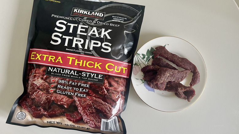 The steak strips are a favorite here on the Tasting Table, as they ranked pretty high among other Costco Kirkland salty snacks. They seem to do quite well among different palates, as they stand apart from Costco's array of jerky options because they have a thicker consistency, and despite the thickness, they are not too firm; you can take a bite without feeling like you have to masticate like a cow.