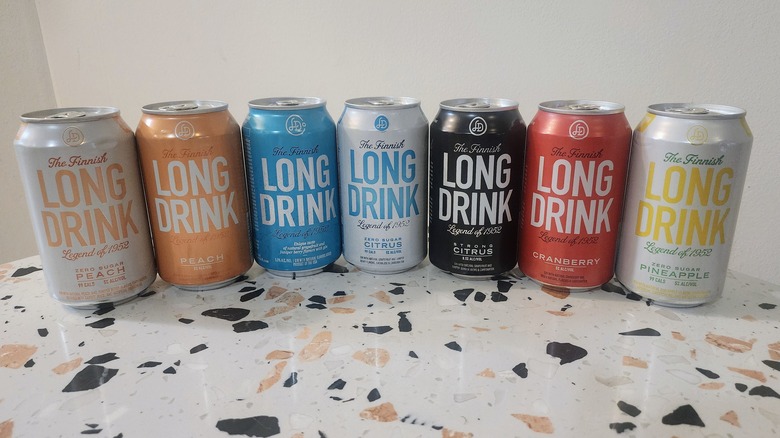 The Finnish Long Drink's carbonated alcoholic beverages use a base of gin (as opposed to malt liquor in White Claws or vodka in High Noons), blended with fruit juices and other fruit-forward flavors to create a canned, ready-to-drink cocktail. I wanted to sample all of the Long Drink offerings, including its two newest flavors (zero-sugar peach and zero-sugar pineapple) to see which tasted the best.