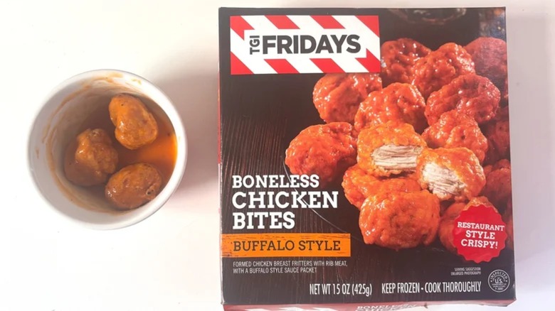 Substandard Buffalo sauce is a big enough problem, but that's not the only thing wrong with this particular appetizer. Reheating these chicken pieces leaves you with oddly-textured bites that have none of what makes boneless wings delicious, and that's sad. There are a ton of complaints out there from dissatisfied customers that say the texture of these are anything but the firmness you expect, with some saying they're more of a processed chicken nugget than the whole breast meat the photos on the box show.