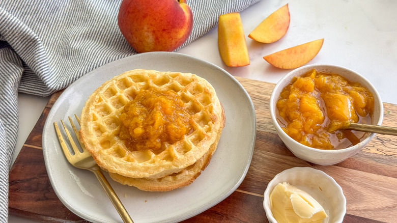 If living in a charming small town is your dream life and you're working on your rapid-fire dialogue skills, you're no doubt a super fan of the popular TV series Gilmore Girls. The show follows the lives of Lorelai Gilmore and her daughter, Rory, who live in the quirky small town of Stars Hollow, which is full of lovable and eccentric townspeople. One of the show's most memorable characters is Sookie St. James, an accident-prone chef who creates exquisite and memorable recipes, including a delicious peach sauce. She feeds a spoonful of it to Lorelei, who declares it incredible. Sookie says she wants to serve it with waffles, and Lorelie responds that she wants to take a bath in it. We'd recommend the waffle option with our version of the incredible Stars Hollow peach sauce recipe, which features peaches, maple syrup, lemon juice, vanilla, and cinnamon.