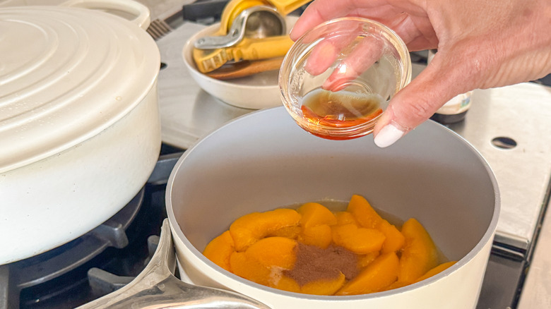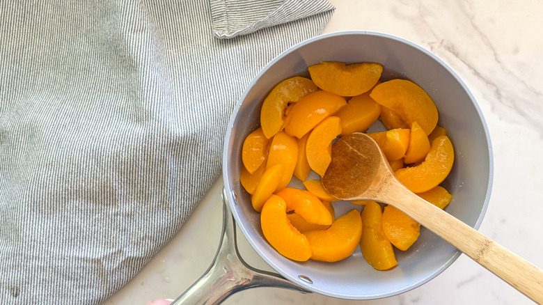 - Add the peaches to a small saucepan and cook over medium for 10 minutes.