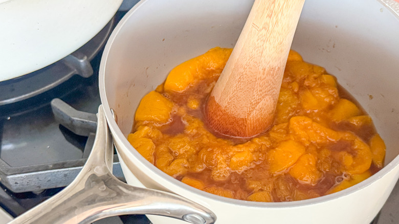 - Mash the peaches with a wooden mallet or potato masher, leaving some chunks for texture, and continue to simmer for 8–10 minutes, until thickened.