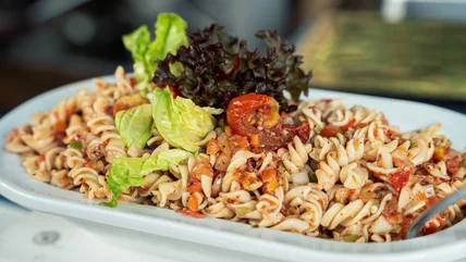 As a general rule, plan on ½ cup to ¾ cup of pasta salad per person as a side dish. This shakes out to four to six ounces of finished, assembled pasta salad per person. If you're serving pasta salad as an entree-sized dish, double that (one to 1 ½ cups per person, eight to 12 ounces). While the exact measurements can vary depending on your selected pasta shape, roughly two ounces of dry pasta hydrates to one cup cooked. As a helpful gauge, to serve smaller crowds or larger gatherings at family barbecues and neighborhood potlucks, multiply the number of anticipated guests by two ounces. So, to feed 60 guests, a foodie would want to boil 120 ounces (7.5 pounds) of dry pasta. This allows room for some folks to take a full cup serving and others to take ½ cup.
