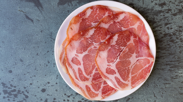 Because coppa has many regional variations in Italy, the flavor can vary quite a bit based on the recipe, but its high fat content means it will always be rich with a creamy texture. Some versions use wine, garlic, and herbs, while others might use more earthy spices like nutmeg and cloves. The most common options in the U.S. are usually divided between standard and hot versions, with the latter being popular in Southern Italy and incorporating flavors like Calabrian chiles. The combination of curing, seasonings, and fat makes coppa intensely flavorful, and it's often used in combination with more mild deli meat for an extra punch of flavor. Its intensity also makes it great thinly sliced by itself or used as a topping for pizza.