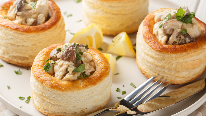 There are so many delicious ways to use up leftover chicken that you'll never have to fret about food waste. A classic American dish that's highly customizable and brimming with flavor, chicken a la king is an ideal choice for times when you want comfort food with minimal effort. This meal typically uses leftover cooked chicken combined with vegetables like mushrooms and peas in a luscious, creamy sauce. When you've got the extra time to make an upscale chicken a la king recipe, there's one simple upgrade that takes the dish to royal status. A light and airy French vol-au-vent made from puff pastry makes an excellent vessel in which to present your chicken a la king, giving it an upside-down pot pie appearance and taste.