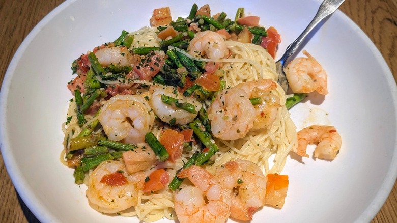 I'm a sucker for any pasta dish where shrimp is the star of the show, so Olive Garden's shrimp scampi didn't have to put up much of a fight to pull me in. This dish came with an extremely generous amount of shrimp — in fact, the shrimp-to-pasta ratio completely caught me off guard. I expected a few tiny shellfish to be floating in a sea of angel hair, but it was quite the opposite. A mound of shrimp, which were deliciously crisp and far from chewy, floated on top of a tiny fistful of noodles, but there were plenty of veggies to make up for the slightly less than ideal amount of pasta. The tomatoes were tart and bright and gave the dish plenty of nuance, and the asparagus was loaded with garden-fresh, sweet, and earthy flavor.
