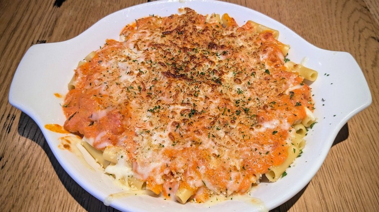 A good baked pasta dish covered in cheese is one of those universally loved meals that rarely misses, and Olive Garden's signature baked pasta is a solid example of everything the chain is capable of. The five-cheese ziti al forno is baked with a blend of Italian cheeses and doused in its famous five-cheese marinara sauce. A little birdie gave me the inside scoop on this sauce: Apparently, it's just a simple mix of Olive Garden's marinara and Alfredo. Nevertheless, the sauce combines everything that makes Alfredo irresistible — decadent, creamy sauce and garlic, but with the bright tang and classic acidity of marinara. The cheese and cream mellow out the acidity, so the sauce is expertly balanced and delicious.