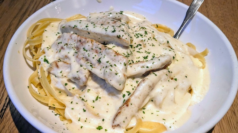 Ah, the almighty chicken Alfredo. There isn't much to hate about a bowl of rich, cheesy Alfredo sauce topped with grilled strips of juicy chicken. The fettuccini acts as a hearty starch that wraps its tendrils around the sliced chicken to give each bite a balanced mixture of meat and pasta. Chicken is just about the safest protein you can pair with any type of pasta dish, and the version served at Olive Garden was no exception. Even so, the chicken Alfredo experience at the OG was, well, average at best.