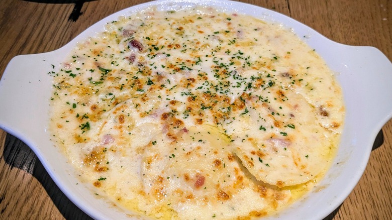 I love a good carbonara, but I'll probably be forgoing Olive Garden's ravioli-based version on my next visit. And no, it's not because I'm a carbonara purist. I expected Olive Garden's iteration to include cream, even though traditional carbonara never includes milk or cream. But the use of cream and its likeness to Alfredo sauce wasn't what made it fall mostly flat in my eyes. The sauce was overly oily to the point where it felt like the ravioli was swimming in a sea of melted butter instead of a sauce. The use of ravioli in a carbonara in the first place seems odd, since the idea behind this dish is that the thick sauce clings to pasta strands, which is why it's traditionally made with spaghetti noodles.