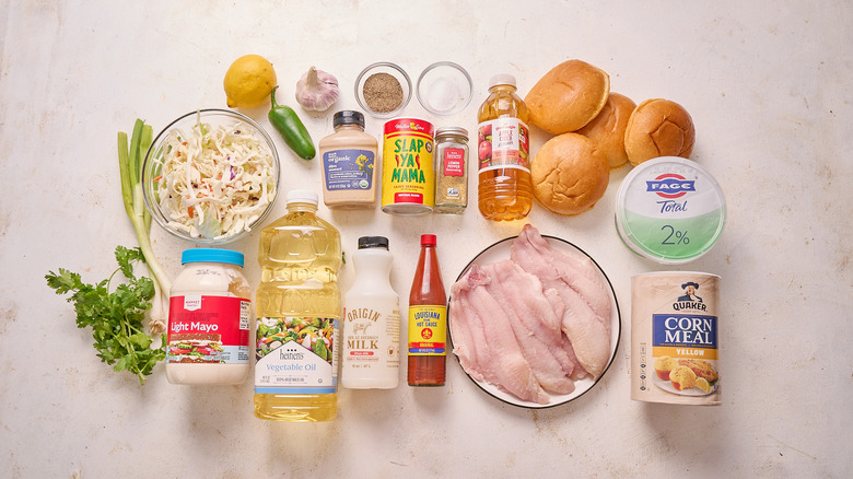 To soak, dredge, and fry the catfish, you'll need milk (or buttermilk), hot sauce (we like a Louisiana hot sauce for this), vegetable oil, cornmeal, Cajun seasoning, lemon pepper seasoning, salt, and catfish filets. You'll reuse some of those ingredients, but for the coleslaw, you'll need to add mayonnaise, Greek yogurt, apple cider vinegar, garlic, pepper, shredded cabbage, chopped cilantro, jalapeño, and scallions to your grocery list. Then for the remoulade, you'll just need Dijon mustard and lemon juice, and to build the sandwiches, some soft brioche buns.