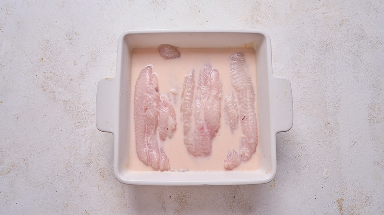 A catfish is marinated in buttermilk or milk to help reduce the muddy flavor. Part of this is because of the acid in buttermilk, which can be replicated with lemon juice, vinegar, or vinegar-based hot sauce; but plain milk is equally as effective in getting rid of fishy flavor because of its casein. This can be done up to 8 hours in advance, but if you don't have a day's worth of time for marinating, even just 20 minutes will do the trick.