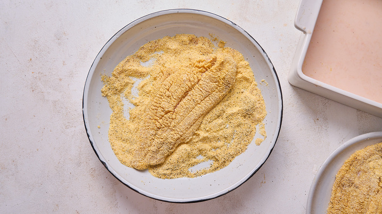 - While the oil is heating up, shake the excess milk from the catfish and dredge each filet in the cornmeal mixture.
