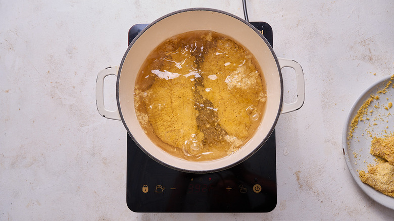 - To fry the fish, first heat oil in a Dutch oven over medium heat to 350 F.