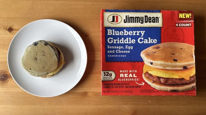 As we mentioned in our review, "That sweetness isn't overwhelming, but it does balance out the saltiness from the sausage patty nicely ... The creaminess of the cheese is ultimately what brings it all together, offering a velvety texture that marries the pancakes and the sausage in perfect harmony." Customer reviews on Jimmy Dean's official website echo our notes. "Surprisingly great combo," writes one fan. "Each ingredient appealed to me and I couldn't deny that they [worked] all together in a sandwich." Other foodies mention that the pancakes stayed moist, not drying out in the microwave like many other frozen offerings. It's worth noting that these tasty, filling beauties are definitely not low-cholesterol or low-sodium offerings. Still, the pancakes are dotted with real blueberries, and each sando packs an impressive 12 grams of protein, a good chunk of the daily 50 grams recommended by the FDA.